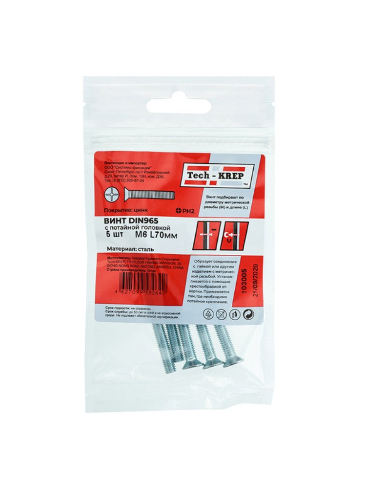 Винт с потайной головкой оцинкованный М6х70 от Tech-Krep представляет собой надежный крепежный элемент, выполненный по стандарту DIN 965. Диаметр резьбы составляет 6 мм, длина — 70 мм, что обеспечивает прочное соединение различных материалов. Поставляется в удобной упаковке по 5 штук. Потайная головка позволяет устанавливать винт заподлицо с поверхностью, что обеспечивает эстетичный вид и минимизирует риск зацепления. Оцинкованное покрытие защищает изделие от коррозии, что делает его подходящим для использования в условиях повышенной влажности. Предназначен для работы с шуруповертом или отверткой с крестовым шлицем PH2.