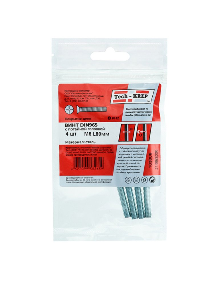 Винт с потайной головкой оцинкованный М6х80 в упаковке 4 штуки от Tech-Krep соответствует стандарту DIN965. Изготовлен из прочной углеродистой стали с цинковым покрытием, что обеспечивает защиту от коррозии и долговечность крепежа. Потайная головка позволяет устанавливать винт заподлицо с поверхностью, обеспечивая аккуратный внешний вид соединения. Подходит для использования с гайками и шайбами соответствующего размера. Диаметр резьбы составляет 6 мм, длина винта — 80 мм, что делает его универсальным решением для различных задач. Тип шлица — крестообразный (Phillips), что упрощает монтаж с помощью стандартных инструментов.
