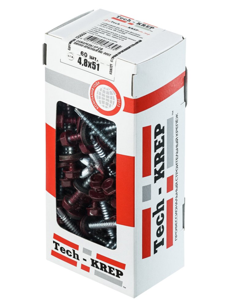 Саморез кровельный сверло 4,8х51 мм в цвете RAL-3005 (винно-красный) от Tech-Krep предназначен для надежного крепления кровельных материалов к металлическим профилям толщиной до 2 мм или деревянным основаниям. Изготовлен из углеродистой стали с антикоррозийным цинковым покрытием, что обеспечивает долговечность и стойкость к атмосферным воздействиям. Шестигранная головка под ключ на 8 мм и шайба с EPDM-прокладкой гарантируют герметичность соединения, защищая от протечек. В упаковке 60 штук, что удобно для небольших и средних объемов работ. Поставляется в коробке с окном для визуального контроля содержимого.