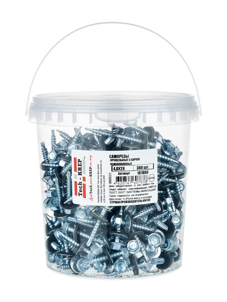 Саморезы КР ZP св. 4,8х28 от Tech-Krep представляют собой надежные крепежные элементы, предназначенные для крепления кровельных материалов к металлическим конструкциям. Изготовлены из высококачественной углеродистой стали с цинковым покрытием, что обеспечивает защиту от коррозии и долговечность. Диаметр 4,8 мм и длина 28 мм делают их универсальными для большинства кровельных работ. В комплекте поставляются в удобном ведре, содержащем 300 штук, что упрощает хранение и транспортировку. Шестигранная головка обеспечивает надежный контакт с инструментом, а острый наконечник гарантирует легкое проникновение в материал без предварительного сверления.