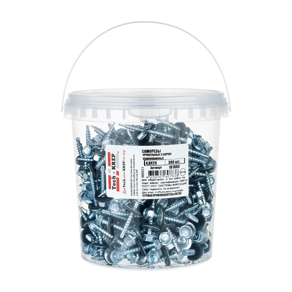 Саморез КР ZP св. 4,8х28 Tech-Krep (300 шт) в ведре – надежный крепеж для кровли из стали с цинковым покрытием, устойчив к коррозии, для металла.