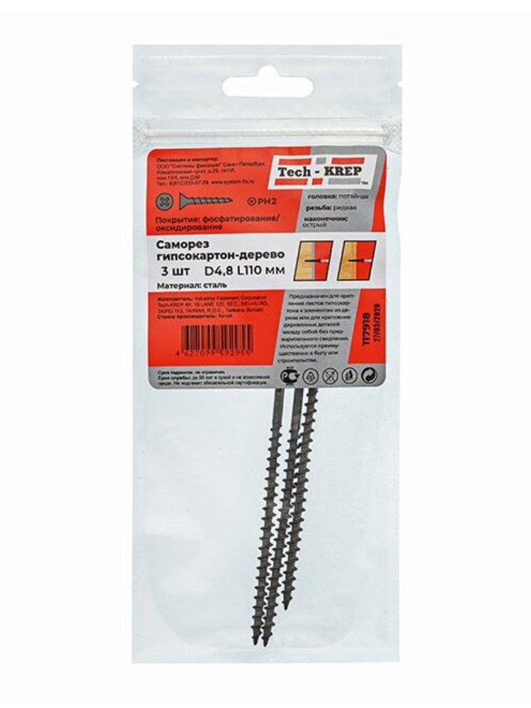Надёжное крепление деревянных конструкций обеспечивается легко и быстро с универсальным саморезом 4,8х110. Идеален для строительных, монтажных и отделочных работ внутри и снаружи помещений.
