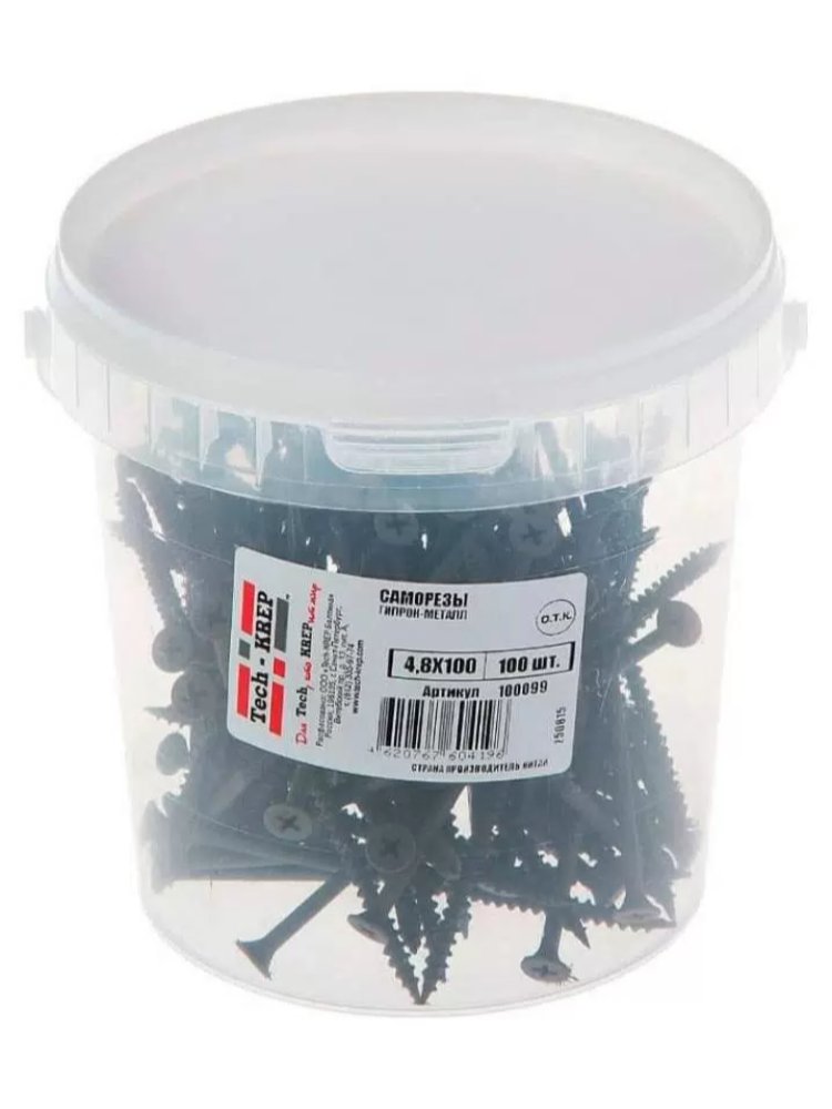 Саморезы по металлу 4,8х100 мм от Tech-Krep представляют собой надежный крепежный элемент, предназначенный для соединения металлических конструкций и листового металла толщиной до 4 мм без предварительного сверления, а также для крепления к деревянным основаниям. Изготовлены из высококачественной углеродистой стали с антикоррозийным цинковым покрытием, что обеспечивает долговечность и устойчивость к внешним воздействиям. Наконечник в виде сверла и крестообразный шлиц PH2 гарантируют удобство и скорость монтажа. Упаковка в виде ведра на 100 штук удобна для хранения и транспортировки.