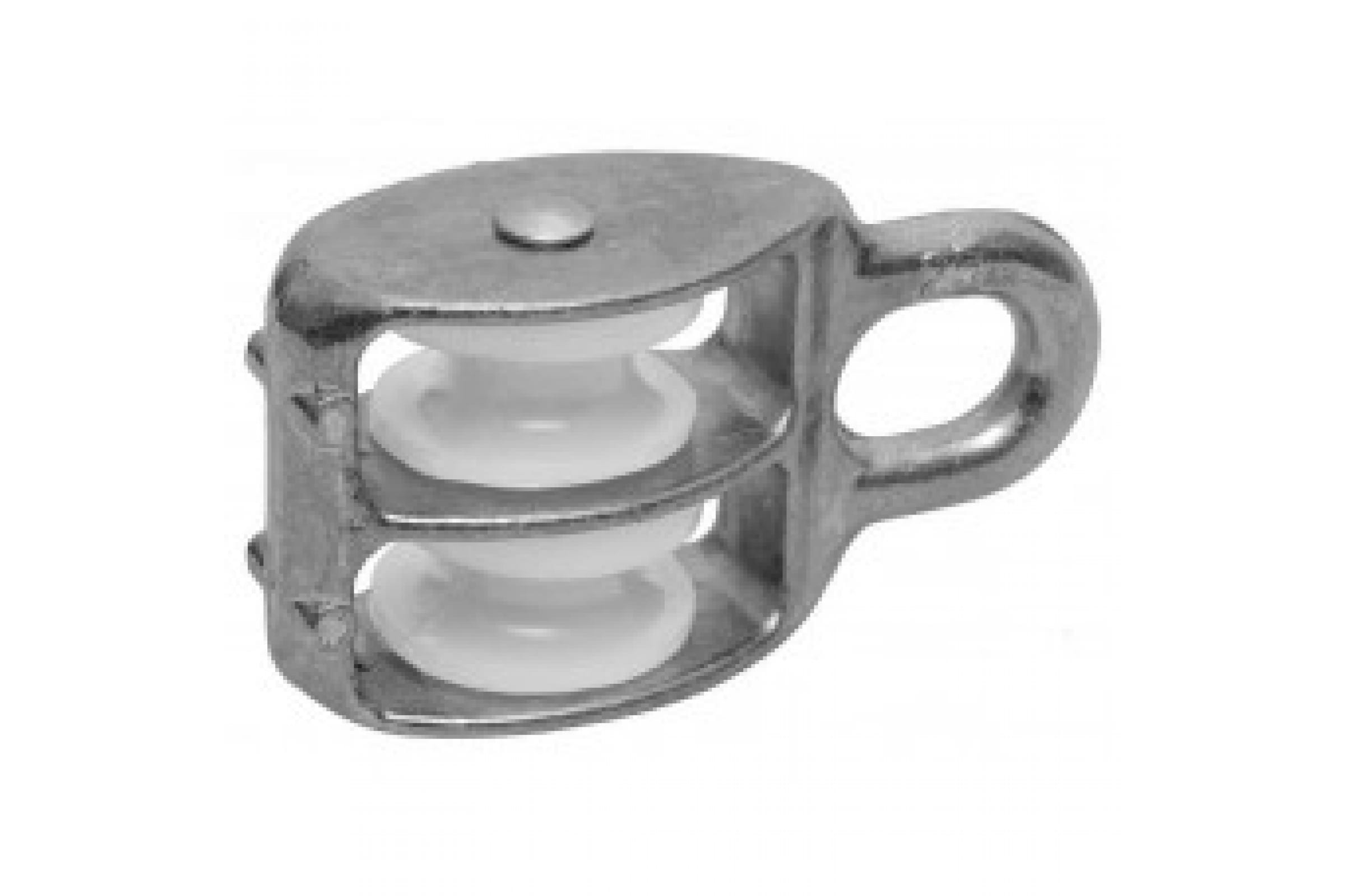 Блок грузовой с двумя нейлоновыми кольцами-шкивами. Имеет дугообразное кольцо в монолите с самим корпусом для крепления крюка или карабина. Такелажный блок применяется в грузоподъёмных конструкциях, для погрузки – подъёма, спуска груза. Используется для изменения вектора движения не стального троса для увеличения силовой тяги в грузоподъёмном механизме, при тяговом усилии на подъём.