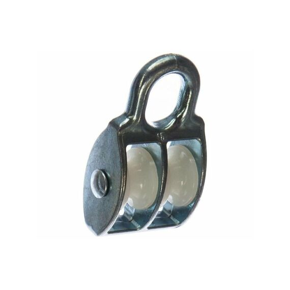 Блок грузовой с двумя нейлоновыми кольцами-шкивами. Имеет дугообразное кольцо в монолите с самим корпусом для крепления крюка или карабина. Такелажный блок применяется в грузоподъёмных конструкциях, для погрузки – подъёма, спуска груза. Используется для изменения вектора движения не стального троса для увеличения силовой тяги в грузоподъёмном механизме, при тяговом усилии на подъём. Двойной нейлоновый блок с роликами 20 мм — надежный и долговечный элемент для тросов в подъемных и строительных механизмах.