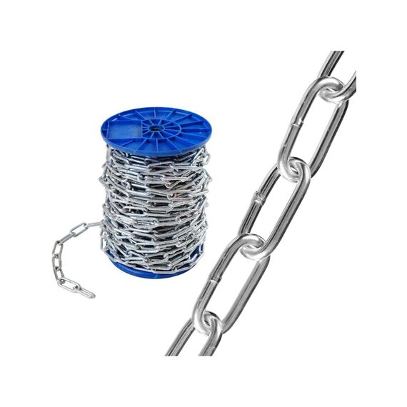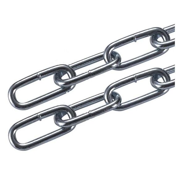 Длиннозвенная цепь DIN 763, оцинкованная, 80 м, устойчива к коррозии, универсальна для крепления, подъёма, буксировки и хозяйственных работ.
