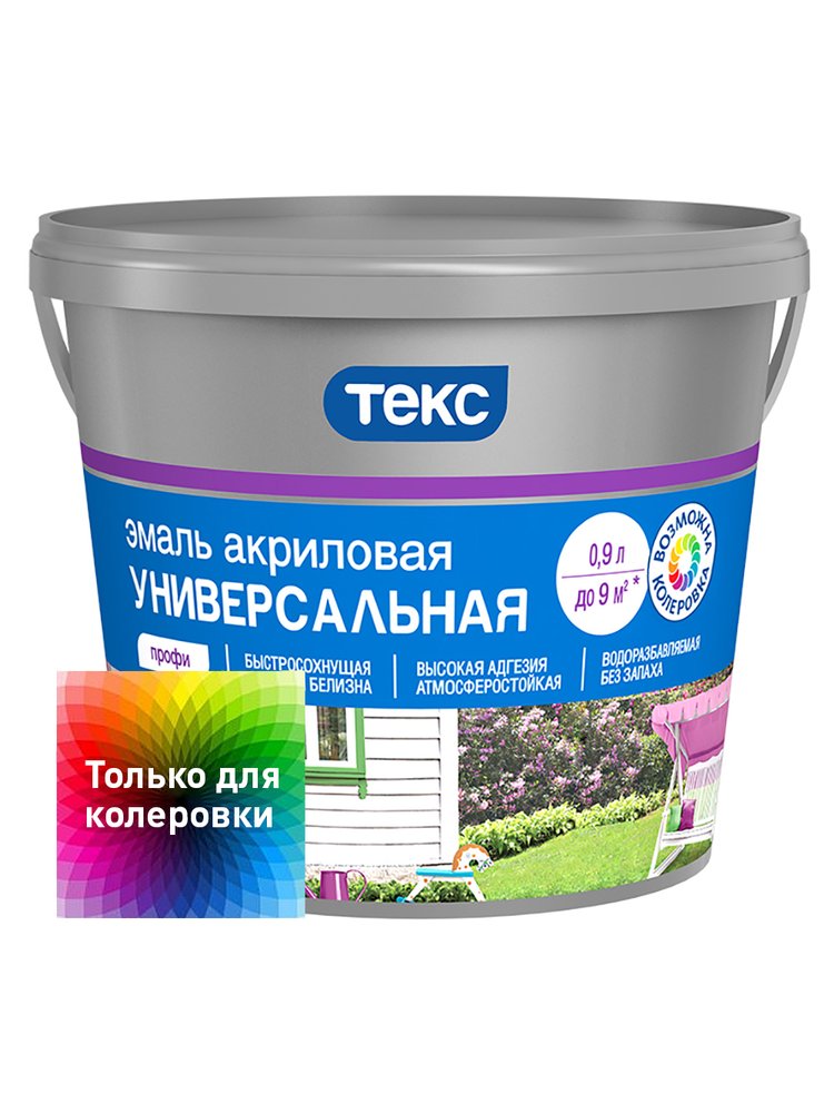 Универсальная акриловая эмаль для внутренних и наружных работ, глянцевая, база D под колеровку, быстро сохнет, устойчива к истиранию и влаге.