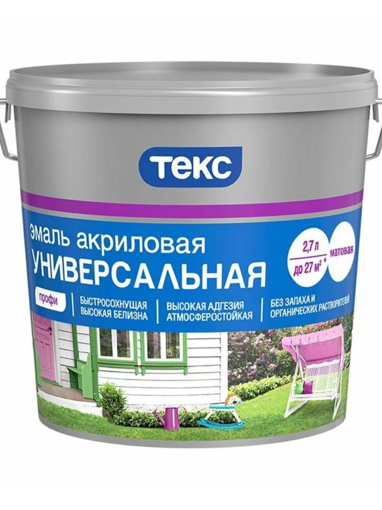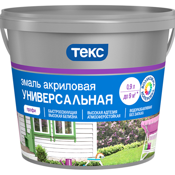 Универсальная акриловая матовая эмаль: быстро сохнет, не желтеет, устойчивая к истиранию, подходит для дерева, металла и бетона.