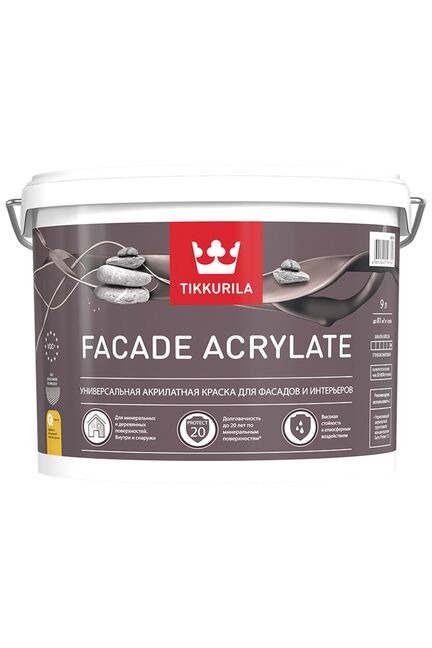 Для применения по минеральным фасадам, цоколям и деревянным фасадам. Для стен и потолков внутри жилых помещений в местах общего пользования (межквартирных коридорах, лестничных клетках, холлах и вестибюлях), а также внутри торговых, промышленных и складских помещений, в том числе с повышенной влажностью. Глубокоматовый. Расход 6–9 м²/л по невпитывающей поверхности; 4–6 м²/л по впитывающей поверхности. Время высыхания 2 часа. Следующий слой можно наносить через 12 часов. следующий слой наносить не ранее, чем через 24 часа. Разбавитель вода. Глубокоматовая акриловая фасадная краска: устойчива к влаге и УФ, скрывает дефекты, быстро сохнет, подходит для любых наружных поверхностей.