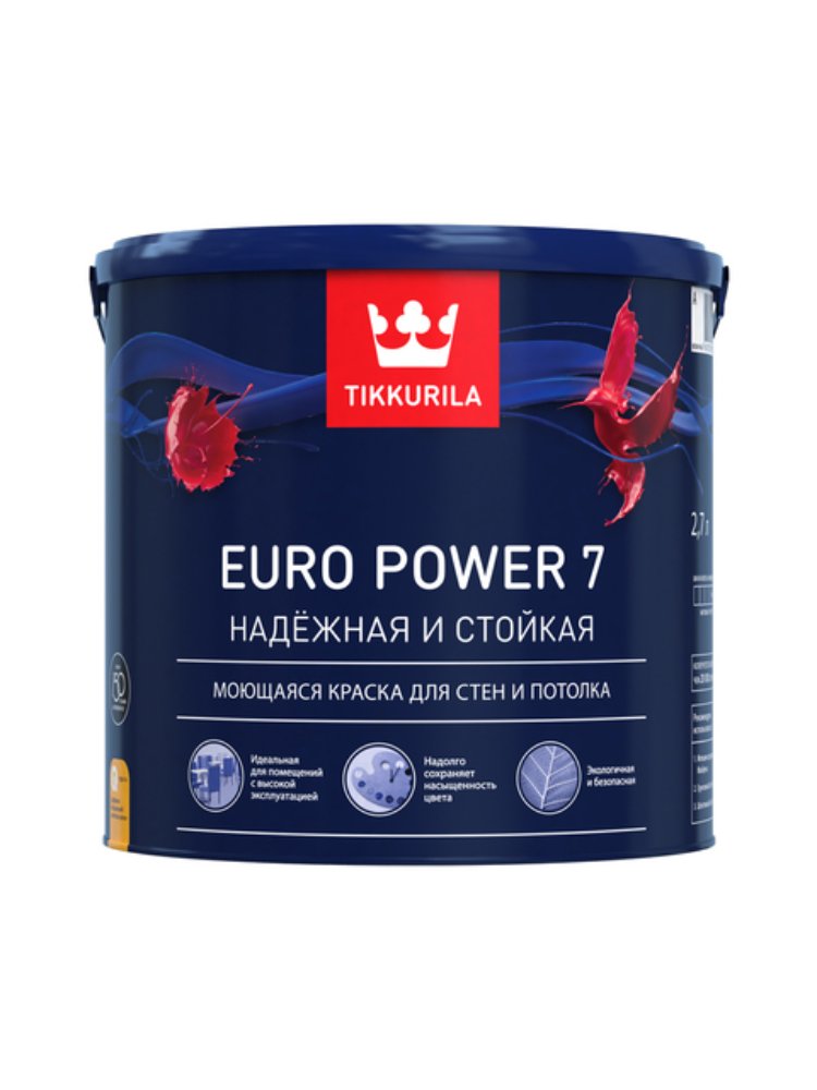 Матовая краска EURO POWER 7 C объемом 2,7 л. Благодаря инновационной формуле краска образует прочное, однородное и износостойкое покрытие, которое сохраняет насыщенность цвета даже после многократной влажной уборки.