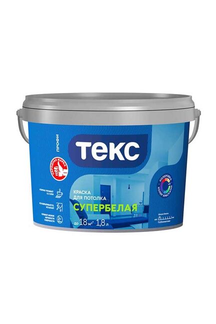Сверхбелая водоэмульсионная краска, быстрое высыхание, матовый финиш, высокая укрывистость, безопасна и удобна для потолков в жилых помещениях.