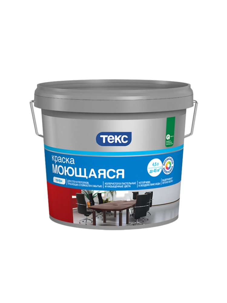 Для окраски стен и потолков внутри сухих помещений и помещений с повышенной влажностью (кухни, ванные, коридоры и др.) по бетонным, оштукатуренным, гипсокартонным, кирпичным, деревянным поверхностям, а также для обоев под окраску. Глубокоматовый. Расход 9-11 м²/л по ровной невпитывающей поверхности; 7-9 м²/л по неровной впитывающей поверхности. Время высыхания 1 час. Следующий слой можно наносить через 1,5 часа. Разбавитель - вода. Моющаяся, износостойкая краска для колеровки и влажных помещений. Легко наносится, до 36 м²/4,5 л, устойчивая к мытью и бытовой химии.