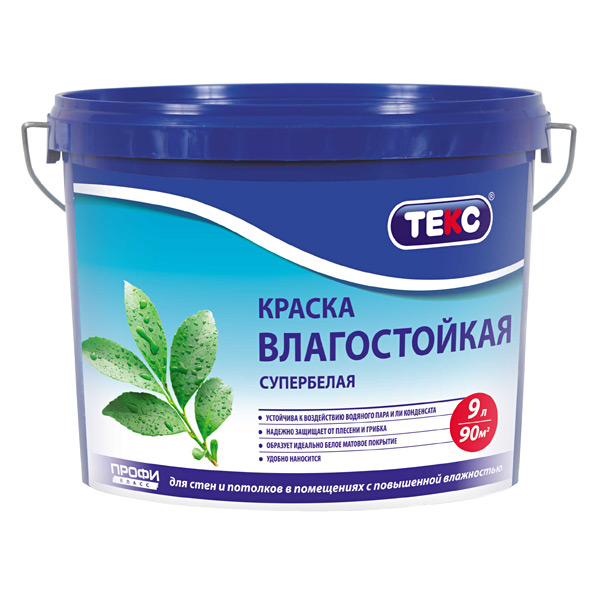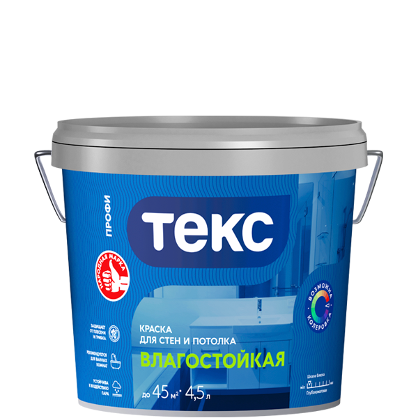 Для окраски стен и потолков внутри сухих помещений и помещений с повышенной влажностью (кухни, ванные, коридоры и др.) по бетонным, оштукатуренным, гипсокартонным, кирпичным и деревянным поверхностям.Глубокоматовая. Время высыхания 1,5 часа. Следующий слой можно наносить через 1,5 часа. Расход 5-7 м²/кг (8-11 м²/л) по ровной невпитывающей поверхности; 4-6 м²/кг (6-9 м²/л) по неровной впитывающей поверхности. Разбавитель - вода. Влагостойкая, белоснежная краска с износостойкой матовой текстурой для стен и потолков в помещениях с повышенной влажностью, объем 4,5 л.