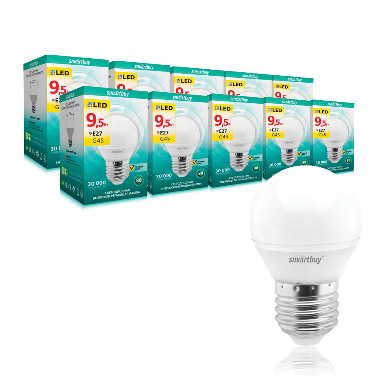 Экономичная лампа 9,5Вт, тёплый свет 3000K, стандартный цоколь E27, ресурс 30 000 ч, мгновенный запуск, не мерцает, устойчива к перепадам.