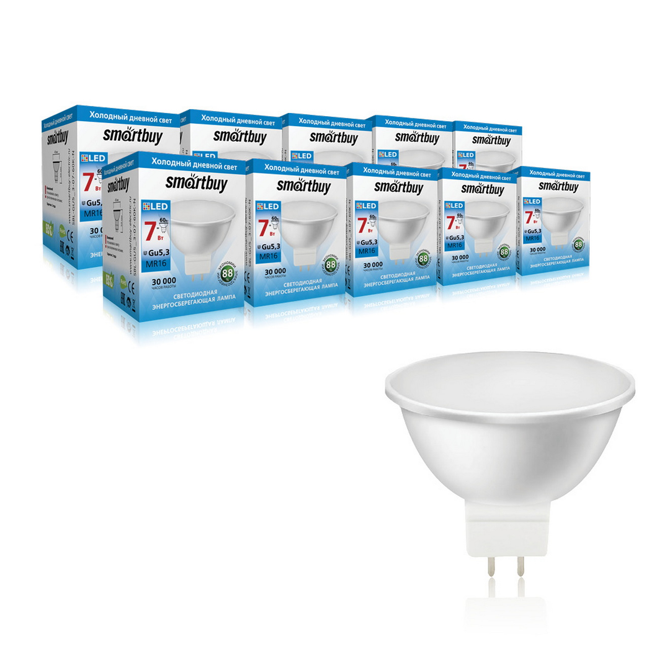 Лампа светодиодная LED-GU5,3 07Вт-6000K Smartbuy
