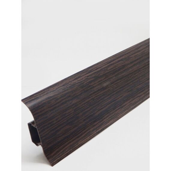 Утонченный и высокий профиль (58 мм) с острыми краями. Благодаря съёмной панели монтаж электрических проводов, покраска стен, оклеивание обоями возможны без демонтажа профилей. Конструкция позволяет монтировать и демонтировать плинтус без использования инструментов. Существует возможность размещения большого количества проводов, в том числе после монтажа. Специальная двухслойная технология: помимо слоя краски, дополнительно покрывается специальным лаком, благодаря чему его покрытие становится однородным, а это дополнительно защищает изделие от разного вида механических повреждений и вредного воздействия лучей УФ. Благодаря эластичному материалу, плинтус идеально прилегает даже к неровностям стен и полов. Пластиковый плинтус 58 мм, в цвете "Венге кофейный", с кабель-каналом. Устойчив к влаге, прост в монтаже, подходит для любых помещений.