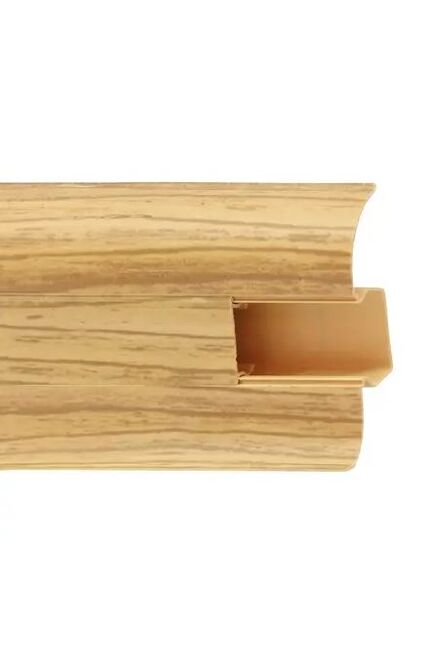 Утонченный и высокий профиль (58 мм) с острыми краями. Благодаря съёмной панели монтаж электрических проводов, покраска стен, оклеивание обоями возможны без демонтажа профилей. Конструкция позволяет монтировать и демонтировать плинтус без использования инструментов. Существует возможность размещения большого количества проводов, в том числе после монтажа. Специальная двухслойная технология: помимо слоя краски, дополнительно покрывается специальным лаком, благодаря чему его покрытие становится однородным, а это дополнительно защищает изделие от разного вида механических повреждений и вредного воздействия лучей УФ. Благодаря эластичному материалу, плинтус идеально прилегает даже к неровностям стен и полов. Универсальный ПВХ-плинтус 58 мм с тёплым тоном дуба, маскирует стыки и кабели, влагостоек, прост в установке для любой комнаты.