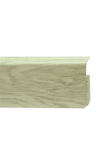 Плинтус 80 мм из прочного ПВХ с текстурой "Дуба Рене", легко монтируется, скрывает провода и надежно защищает стыки пола и стены.