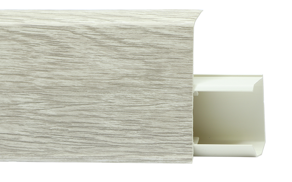 Плинтус 72 мм длиной 2,2 м, влагостойкий, с имитацией дуба, защищает стены и скрывает кабели, подходит для жилых и коммерческих интерьеров.