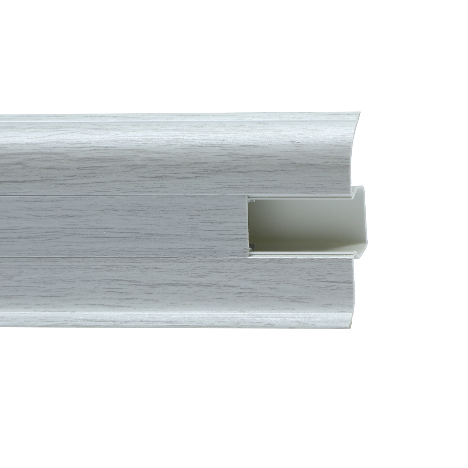 Утонченный и высокий профиль (58 мм) с острыми краями. Благодаря съёмной панели монтаж электрических проводов, покраска стен, оклеивание обоями возможны без демонтажа профилей. Конструкция позволяет монтировать и демонтировать плинтус без использования инструментов. Существует возможность размещения большого количества проводов, в том числе после монтажа. Специальная двухслойная технология: помимо слоя краски, дополнительно покрывается специальным лаком, благодаря чему его покрытие становится однородным, а это дополнительно защищает изделие от разного вида механических повреждений и вредного воздействия лучей УФ. Благодаря эластичному материалу, плинтус идеально прилегает даже к неровностям стен и полов.