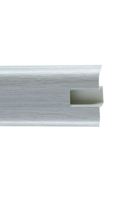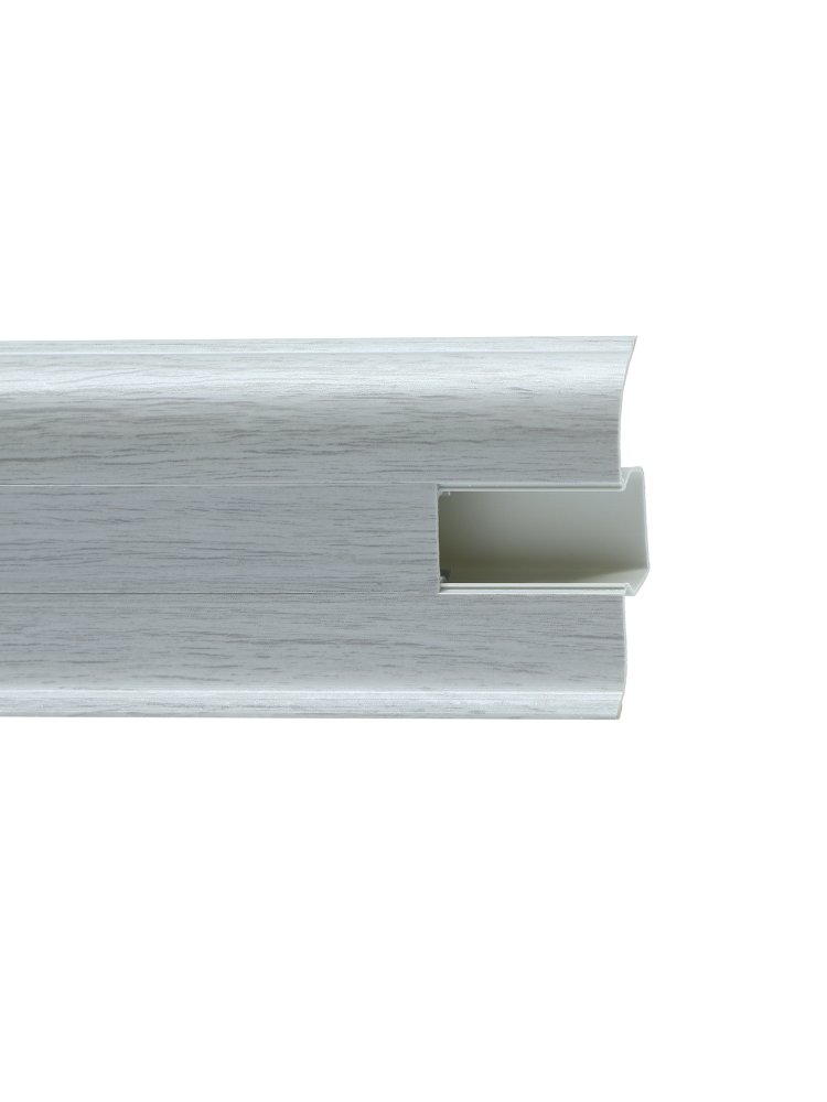 Утонченный и высокий профиль (58 мм) с острыми краями. Благодаря съёмной панели монтаж электрических проводов, покраска стен, оклеивание обоями возможны без демонтажа профилей. Конструкция позволяет монтировать и демонтировать плинтус без использования инструментов. Существует возможность размещения большого количества проводов, в том числе после монтажа. Специальная двухслойная технология: помимо слоя краски, дополнительно покрывается специальным лаком, благодаря чему его покрытие становится однородным, а это дополнительно защищает изделие от разного вида механических повреждений и вредного воздействия лучей УФ. Благодаря эластичному материалу, плинтус идеально прилегает даже к неровностям стен и полов. Плинтус 58 мм, длина 2,5 м, с кабель-каналом, устойчив к влаге и царапинам, легко монтируется, подходит для любых напольных покрытий.