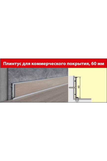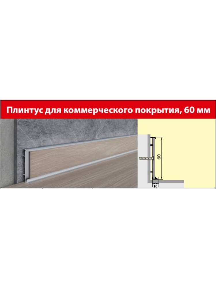 Идеальное решение для оформления коммерческих помещений любого назначения — современный алюминиевый плинтус 60 мм высотой эффективно защищает стены от механических повреждений и загрязнений, гарантируя долгий срок службы и эстетичный внешний вид.