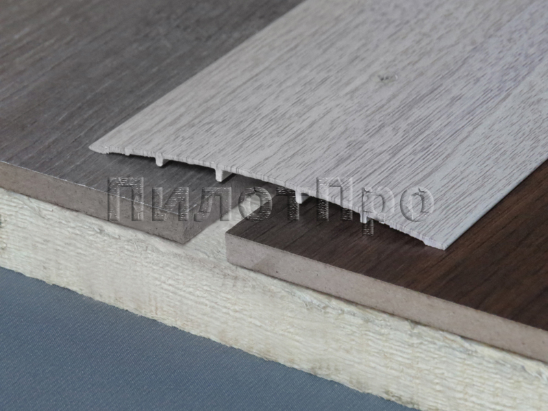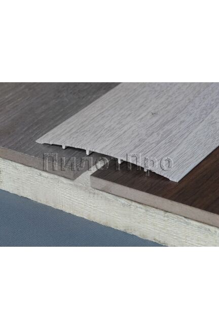 Широкий анодированный алюминиевый порог 100х900 мм, фактура дуба беленого, защищает стык и придаёт полу завершённый аккуратный вид.
