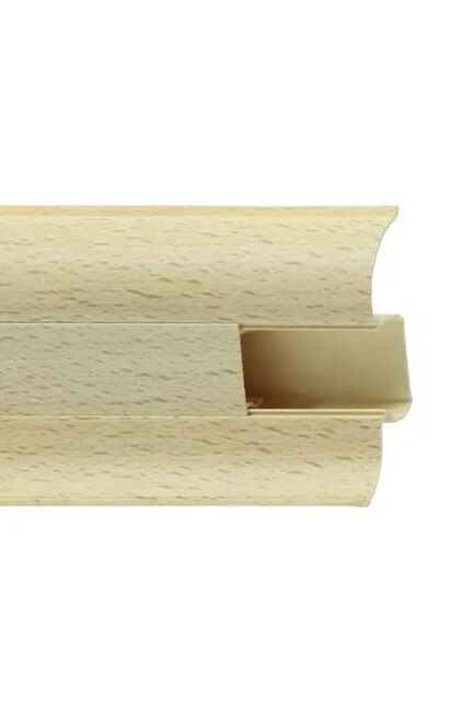 Утонченный и высокий профиль (58 мм) с острыми краями. Благодаря съёмной панели монтаж электрических проводов, покраска стен, оклеивание обоями возможны без демонтажа профилей. Конструкция позволяет монтировать и демонтировать плинтус без использования инструментов. Существует возможность размещения большого количества проводов, в том числе после монтажа. Специальная двухслойная технология: помимо слоя краски, дополнительно покрывается специальным лаком, благодаря чему его покрытие становится однородным, а это дополнительно защищает изделие от разного вида механических повреждений и вредного воздействия лучей УФ. Благодаря эластичному материалу, плинтус идеально прилегает даже к неровностям стен и полов. Внутренний уголок 58 мм, светлый бук — надёжное решение для аккуратных, прочных и эстетичных соединений плинтусов в любом интерьере.
