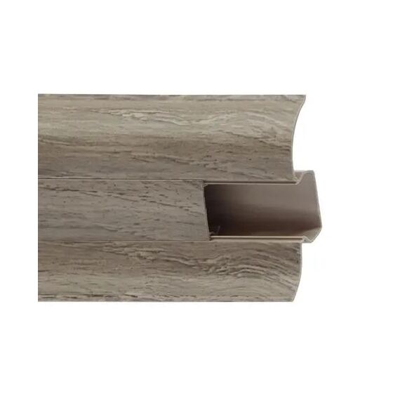 Утонченный и высокий профиль (58 мм) с острыми краями. Благодаря съёмной панели монтаж электрических проводов, покраска стен, оклеивание обоями возможны без демонтажа профилей. Конструкция позволяет монтировать и демонтировать плинтус без использования инструментов. Существует возможность размещения большого количества проводов, в том числе после монтажа. Специальная двухслойная технология: помимо слоя краски, дополнительно покрывается специальным лаком, благодаря чему его покрытие становится однородным, а это дополнительно защищает изделие от разного вида механических повреждений и вредного воздействия лучей УФ. Благодаря эластичному материалу, плинтус идеально прилегает даже к неровностям стен и полов. Аккуратное соединение плинтусов, стильная расцветка — дуб Шервуд, монтаж без инструментов. В упаковке 2 штуки —  для идеального стыка и долгой службы.