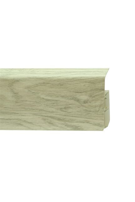 Утонченный и высокий профиль (80 мм) с острыми краями. Благодаря съёмной панели монтаж электрических проводов, покраска стен, оклеивание обоями возможны без демонтажа профилей. Конструкция позволяет монтировать и демонтировать плинтус без использования инструментов. Существует возможность размещения большого количества проводов, в том числе после монтажа. Специальная двухслойная технология: помимо слоя краски, дополнительно покрывается специальным лаком, благодаря чему его покрытие становится однородным, а это дополнительно защищает изделие от разного вида механических повреждений и вредного воздействия лучей УФ. Благодаря эластичному материалу, плинтус идеально прилегает даже к неровностям стен и полов. Внутренний угол для плинтуса 80 мм, фактура дуба, идеально скрывает стыки и обеспечивает аккуратный переход в углах помещения.