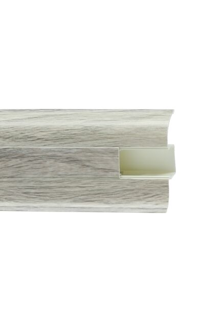 Утонченный и высокий профиль (58 мм) с острыми краями. Благодаря съёмной панели монтаж электрических проводов, покраска стен, оклеивание обоями возможны без демонтажа профилей. Конструкция позволяет монтировать и демонтировать плинтус без использования инструментов. Существует возможность размещения большого количества проводов, в том числе после монтажа. Специальная двухслойная технология: помимо слоя краски, дополнительно покрывается специальным лаком, благодаря чему его покрытие становится однородным, а это дополнительно защищает изделие от разного вида механических повреждений и вредного воздействия лучей УФ. Благодаря эластичному материалу, плинтус идеально прилегает даже к неровностям стен и полов.