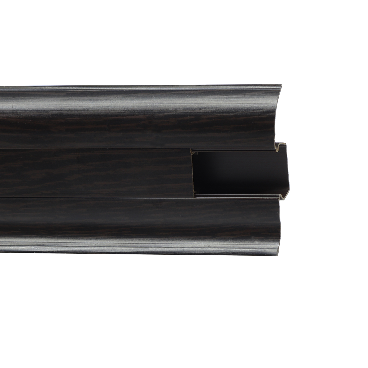 Утонченный и высокий профиль (58 мм) с острыми краями. Благодаря съёмной панели монтаж электрических проводов, покраска стен, оклеивание обоями возможны без демонтажа профилей. Конструкция позволяет монтировать и демонтировать плинтус без использования инструментов. Существует возможность размещения большого количества проводов, в том числе после монтажа. Специальная двухслойная технология: помимо слоя краски, дополнительно покрывается специальным лаком, благодаря чему его покрытие становится однородным, а это дополнительно защищает изделие от разного вида механических повреждений и вредного воздействия лучей УФ. Благодаря эластичному материалу, плинтус идеально прилегает даже к неровностям стен и полов.