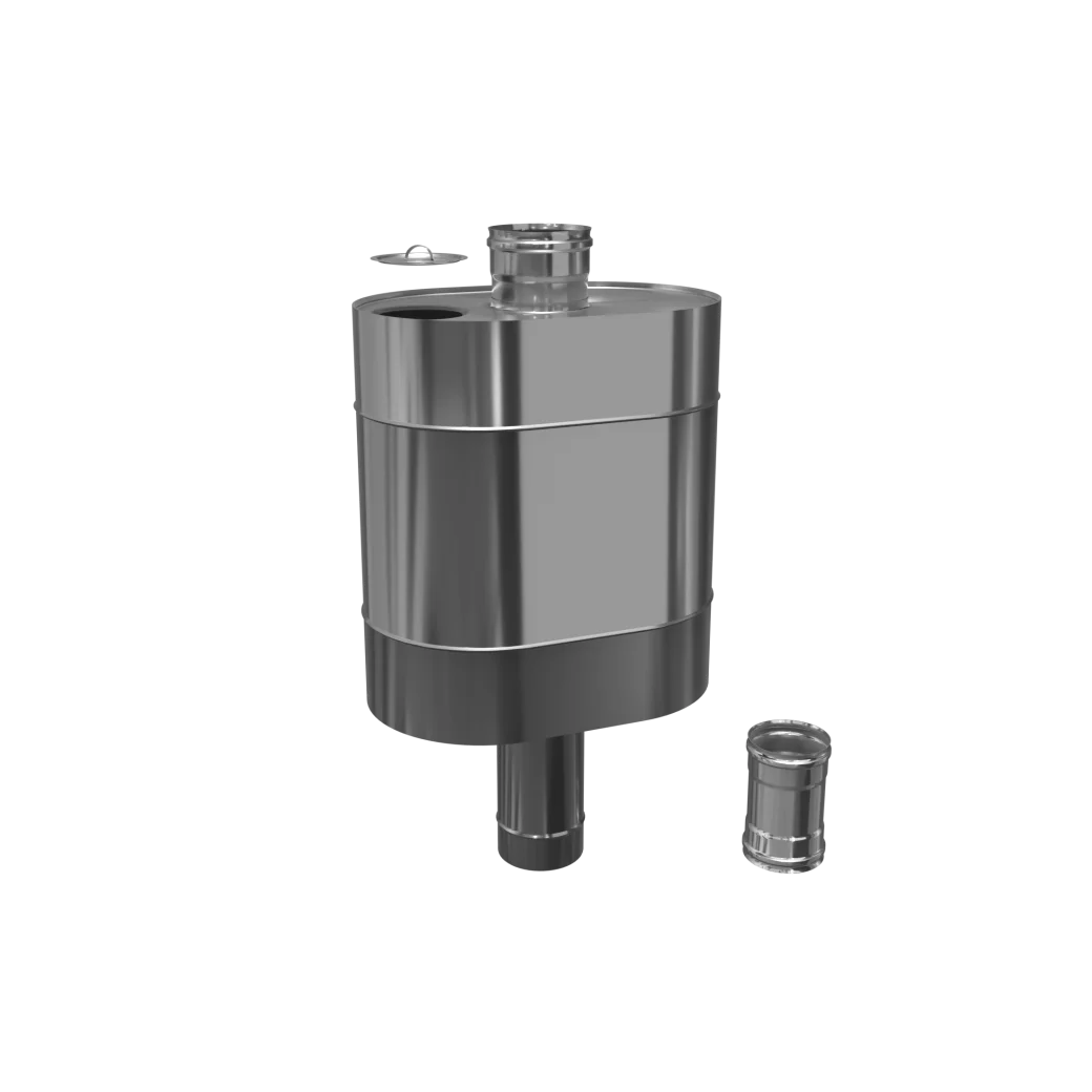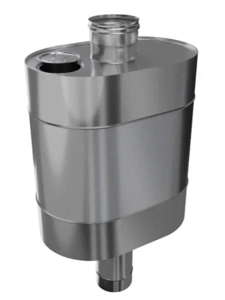 Конструкция бака состоит из стального корпуса эллиптической формы, который закреплён на трубе-дымоходе. Обечайка, труба и нижняя стенка бака выполнены из стали AISI 201, толщина — 1 мм. Верхняя стенка бака, крышка и адаптер М-М выполнены из стали AISI 430, толщина — 0,8 мм. На нижней стенке корпуса бака расположен сливной штуцер с наружной трубной резьбой 1/2 дюйма. Установка бака производится "по конденсату". Нижняя часть трубы бака теперь разъемная. Проверенный честный объём бака. Адаптер М-М 235 мм в комплекте! Прочный бак 50 л на трубе d115 мм для бани или дома, быстро нагревает воду, экономит место, устойчив к коррозии, легко обслуживается.