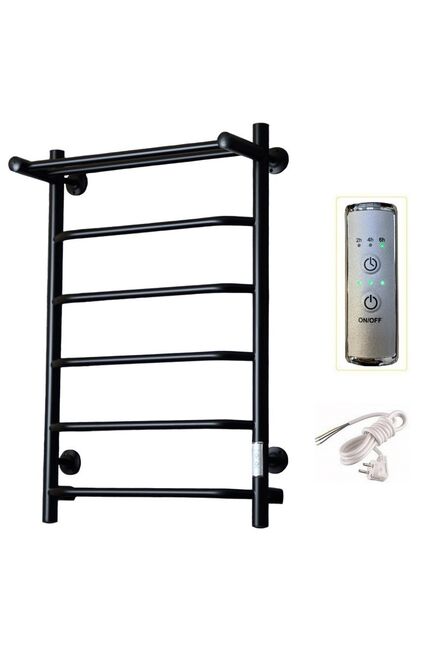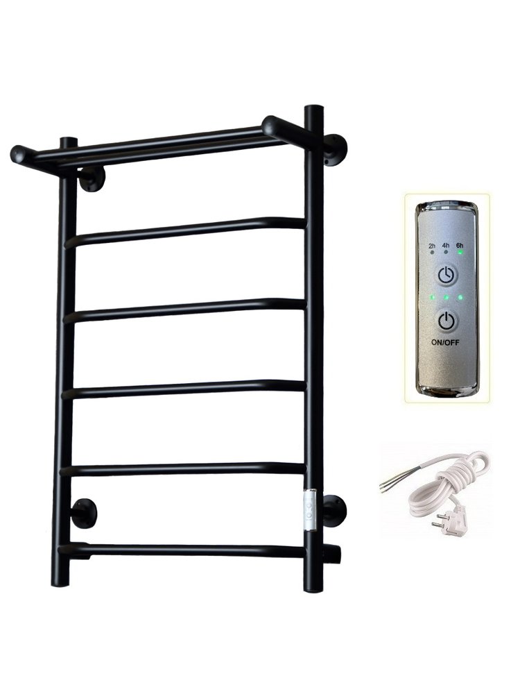Изделие производится из углеродистой стали. Вертикальные трубы d-32 мм, для горизонтальных вставок используется труба d-18 мм. Нагревательным элементом в полотенцесушителе является греющий кабель — аналог «теплого пола», кабель заправляется внутрь каждой трубы и передает тепло на поверхность изделия. Во включенном состоянии постоянно поддерживается температура 50-60 градусов. Полотенцесушитель снабжен панелью управления. Кнопка включения/выключения и таймер на 2/4/6 часов , который позволяет включать изделие на ограниченное время. Эта функция дает возможность экономить электричество. Стильный черный полотенцесушитель 80×50 см, 6 перекладин, легко монтируется, быстро сушит бельё и предотвращает сырость в ванной.