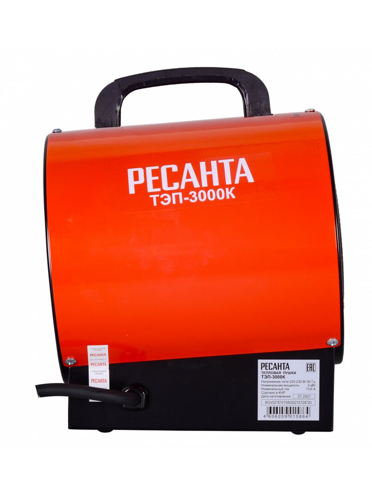 Тепловая пушка РЕСАНТА ТЭП-3000К мощностью 3 кВт предназначена для быстрого обогрева и просушки помещений. Устройство оснащено круглым корпусом, который обеспечивает равномерное распределение теплого воздуха. Имеет три режима работы: вентиляция без нагрева и два уровня мощности обогрева (1,5 кВт и 3 кВт), что позволяет выбрать оптимальный вариант в зависимости от потребностей. Компактные размеры и удобная ручка делают пушку мобильной и легкой в транспортировке. Корпус выполнен из прочного металла, устойчивого к механическим повреждениям, а встроенная защита от перегрева гарантирует безопасность эксплуатации. Подходит для использования в бытовых и производственных условиях.