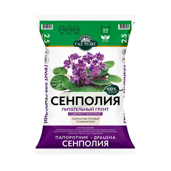 Питательный, рыхлый грунт 2,5 л для сенполий: обеспечивает быстрый рост, корнеобразование и обильное цветение домашних фиалок.