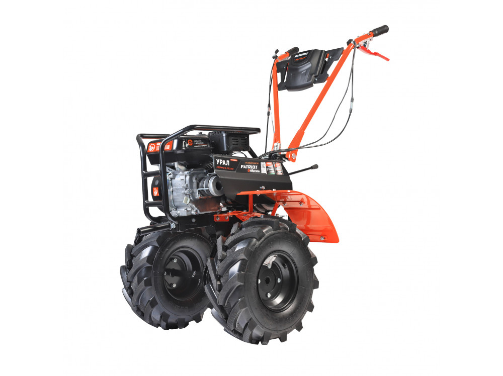 Урал - бензиновый мотоблок с 4-х тактным двигателем повышенного ресурса и цельнолитым чугунным цепным редуктором. Конструкция рамы облегчает транспортировку мотоблока и защищает двигатель, глушитель и бензобак. 4-х ступенчатая коробка передач. Перекидывание ремня между проточками трехручейкового шкива включает пониженную передачу. На сцепку устанавливается навесное оборудование или тележка. В комплекте закаленные фрезы, широкие колеса Extreme с глубоким протектором, сошник. Кнопка включения, рукоятка газа и рычаг привода расположены на руле. Наклон руля регулируется.