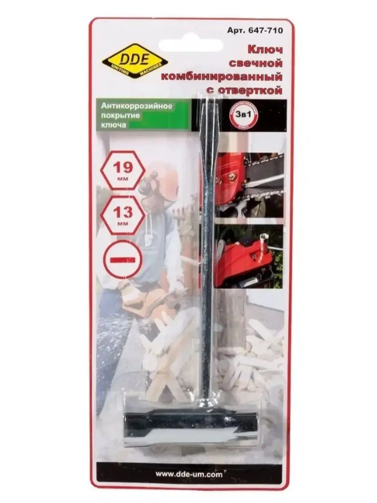 Профессиональный инструмент для обслуживания автомобилей и спецтехники: свечной комбинированный ключ DDE 13*19 мм артикул 647-710 обеспечивает надежное и легкое откручивание и закручивание свечей зажигания и других резьбовых соединений. Применяется в автосервисах, гаражах, мастерских и при домашнем ремонте техники.