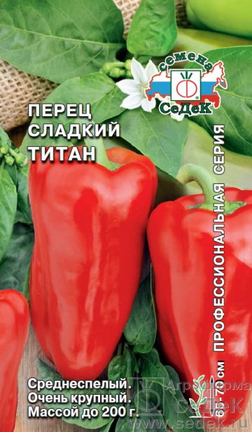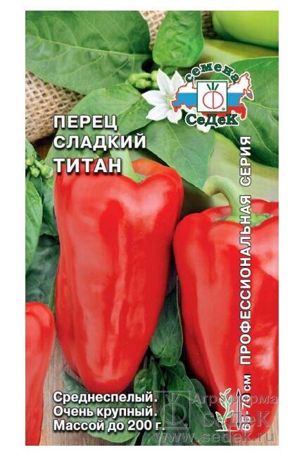 Семена сладкого перца Титан, 0,1 г, от СеДеК. Крупные плоды до 300 г, урожайность до 6 кг/м², толстая стенка, отличный вкус. Для открытого грунта и теплиц.