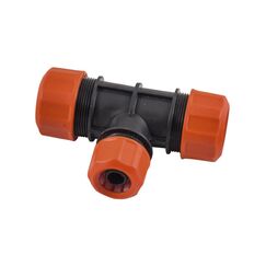 Цанговый тройник для герметичного соединения трех 1/2" труб, прочный корпус и простая установка без инструментов, подходит для воды и полива.