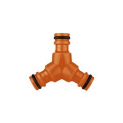 Удобный тройник-распределитель для шлангов с тремя штуцерами, прочный пластик, герметичные соединения, оптимален для систем полива и водоснабжения.