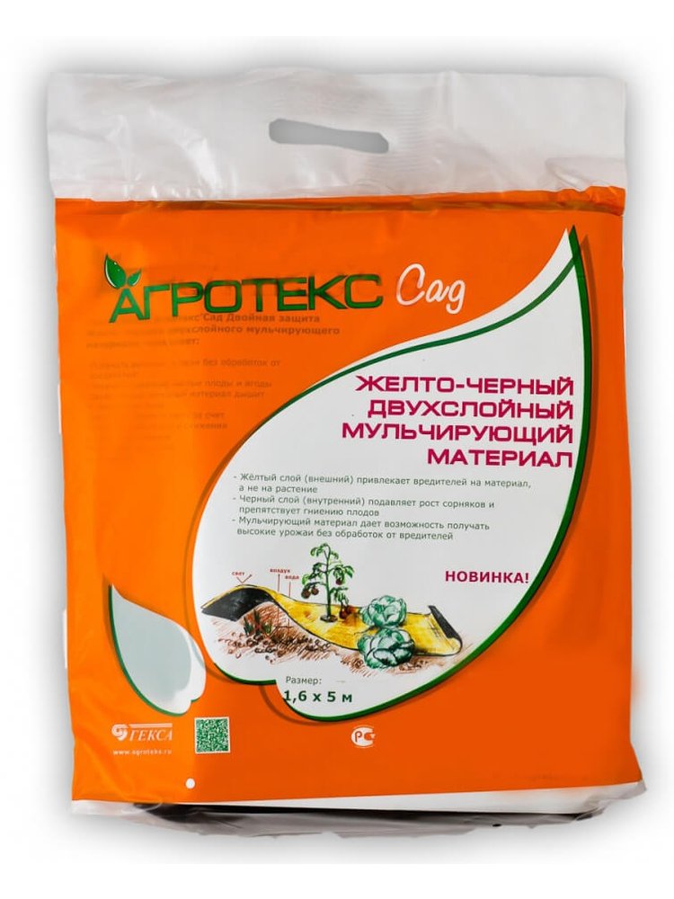 - Двухслойная структура: черный нижний слой блокирует свет для подавления сорняков; желтый верхний — отпугивает вредителей