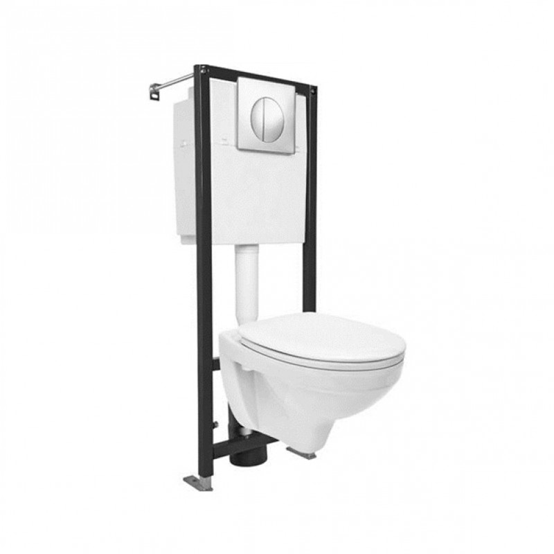 Комплект унитаза с инсталляцией Cersanit Delfi" - инсталляция, унитаз, сиденье, клавиша смыва Унитаз с крышкой-сиденьем Размеры чаши: (ШхДхВ): 36x52,3x37 см. Выпуск: горизонтальный (в стену). Крышка-сиденье: Дюропласт, микролифт Инсталляция с клавишей смыва: Максимальная нагрузка: 400 кг. Объем смывного бачка: 3/6 л. Режим слива воды: две кнопки (режим эконом). Тип запуска слива: механическая кнопка. Цвет кнопки смыва: хром глянцевый. Инсталляция с черной рамой, унитаз и клавиша смыва. Современный стиль, прочность, комплект для быстрой установки и экономии пространства.