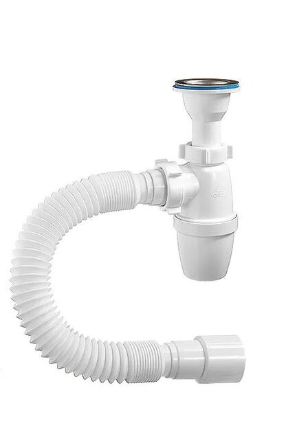 Бутылочный сифон с литым выпуском и гибкой трубой 40x40/50 мм для надежного и герметичного слива, прост в установке и защите от неприятных запахов.