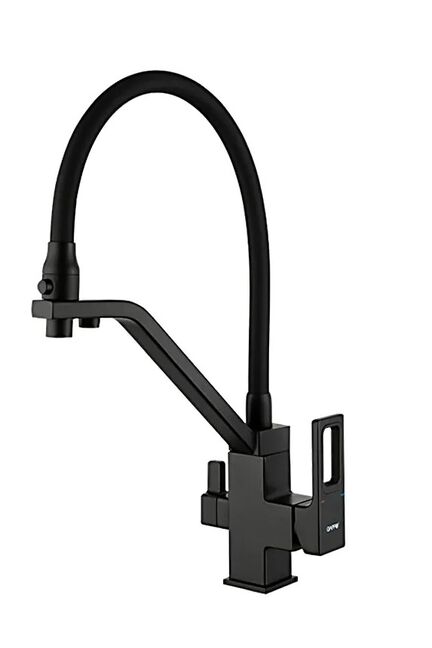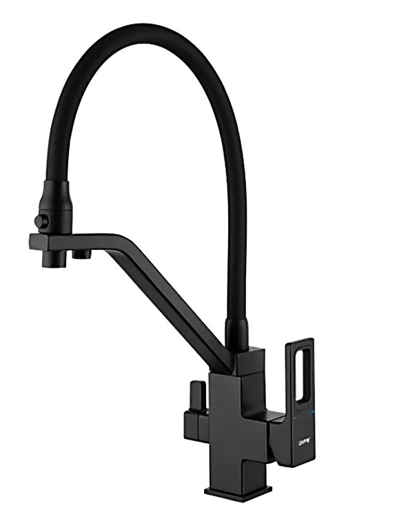 Смеситель с гибким изливом, отдельным каналом для фильтрованной воды и стильным черным покрытием — комфорт и безопасность на вашей кухне.