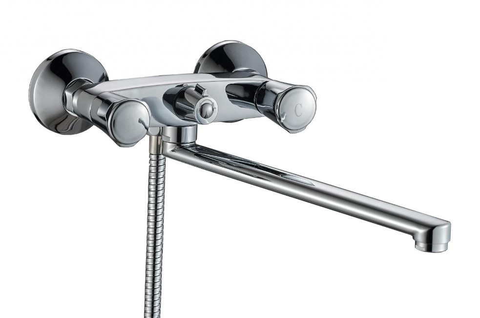 Двуручный смеситель с изливом 30 см для ванны, латунь, хром, удобная регулировка напора и температуры, долговечность и простота монтажа.