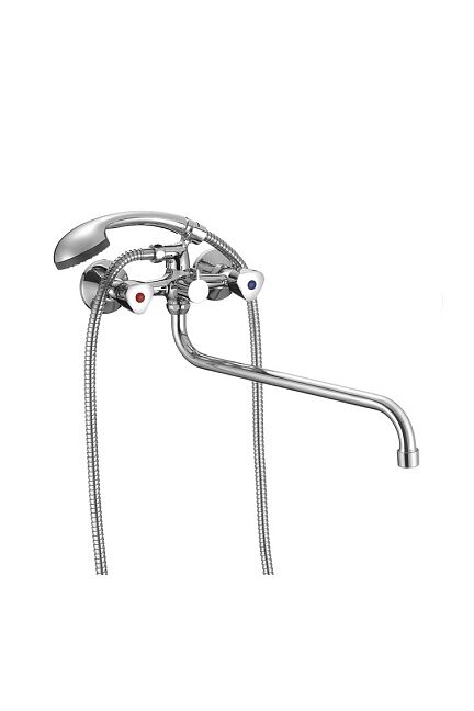 Двуручный смеситель с изливом 35 см, устойчив к коррозии, подходит для ванн разных размеров, обеспечивает точную регулировку воды.