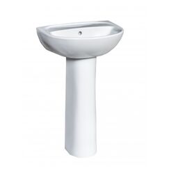 Компактный умывальник из прочной керамики, с пьедесталом, прост в уходе, скрывает трубы, подходит для любых санузлов и интерьеров.
