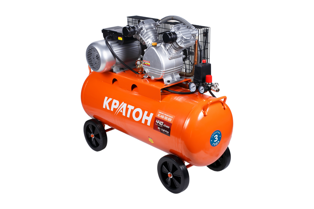 Двухцилиндровый компрессор AC-440-100-BDV марки Кратон, благодаря высокой производительности и повышенной мощности электродвигателя, допускается к использованию с различным пневмоинструментом на крупном производстве, в цеху или СТО. Конструкция изготовлена из высокопрочного сплава и оснащена системой охлаждения, благодаря которой компрессор может работать длительное время без перегрева. Прочный кожух надежно укрывает систему передачи от механических повреждений.