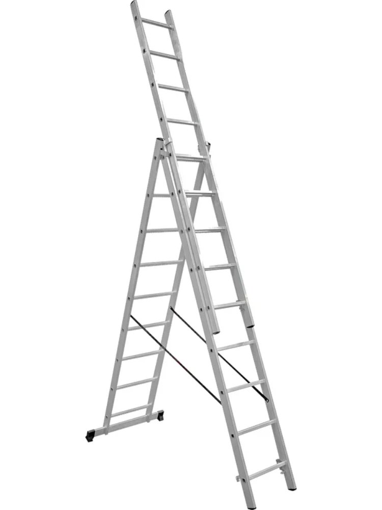 Лёгкая и прочная универсальная алюминиевая лестница с тремя секциями и девятью ступенями — отличное решение для строительных, отделочных и ремонтных работ на высоте до 5,94 м. Идеально подходит для профессионалов и домашних мастеров, обеспечивая безопасный доступ к труднодоступным местам внутри и вне помещения.
